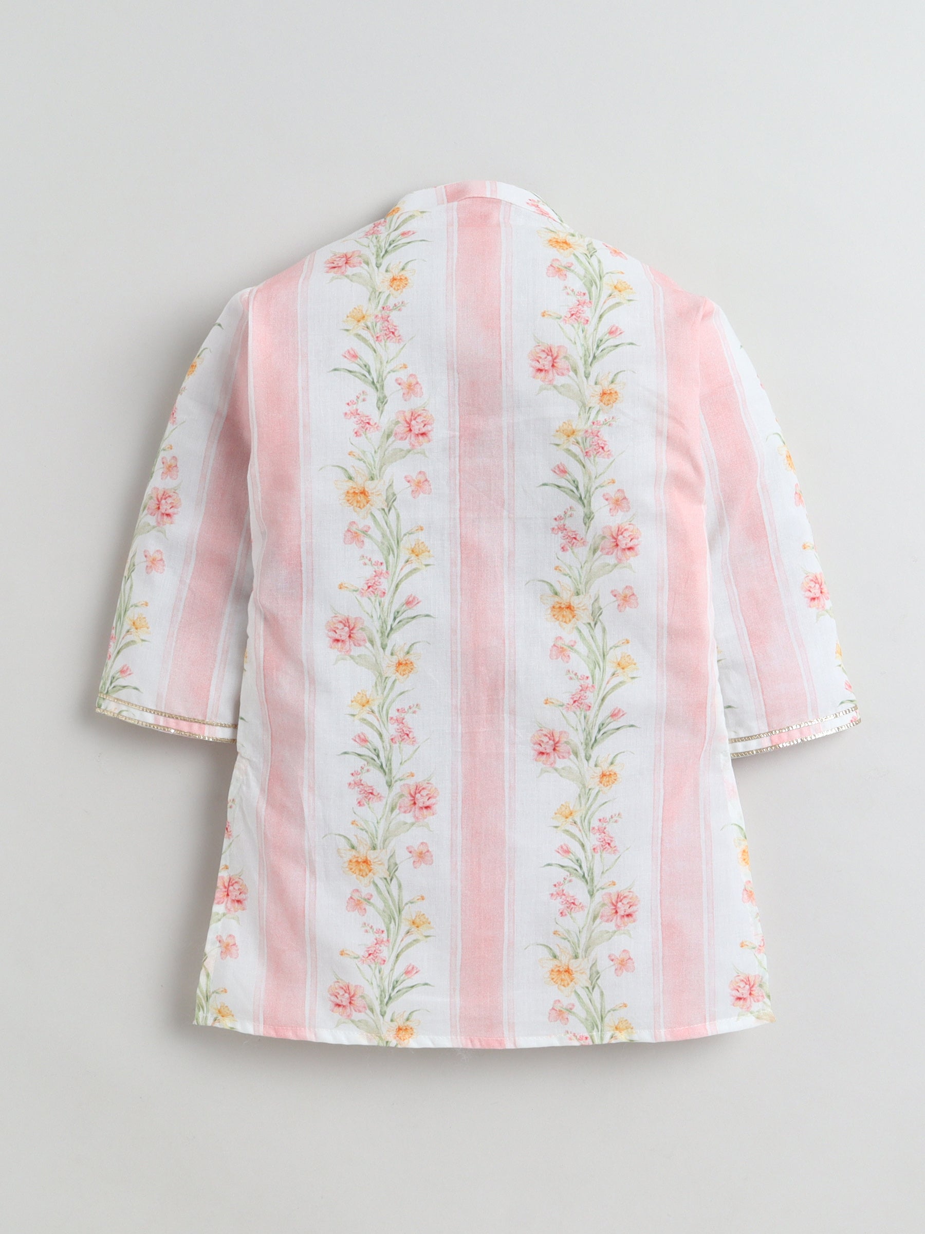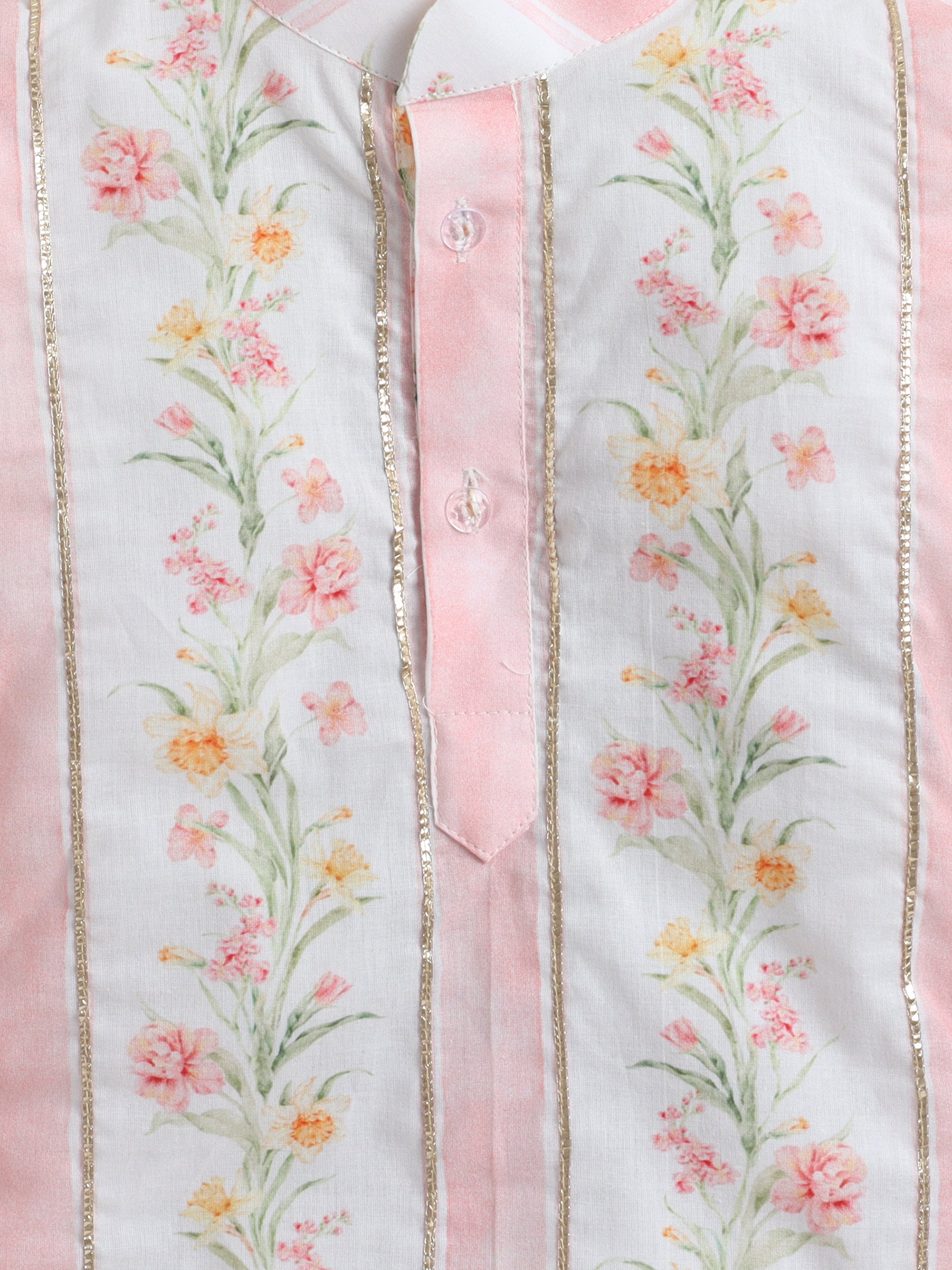 The kurta features delicate vertical floral panels in soft blush tones, highlighted with subtle gold detailing that adds just the right festive glow. The lightweight fabric keeps your child cool and comfortable, while the straight silhouette allows easy movement for playful celebrations.