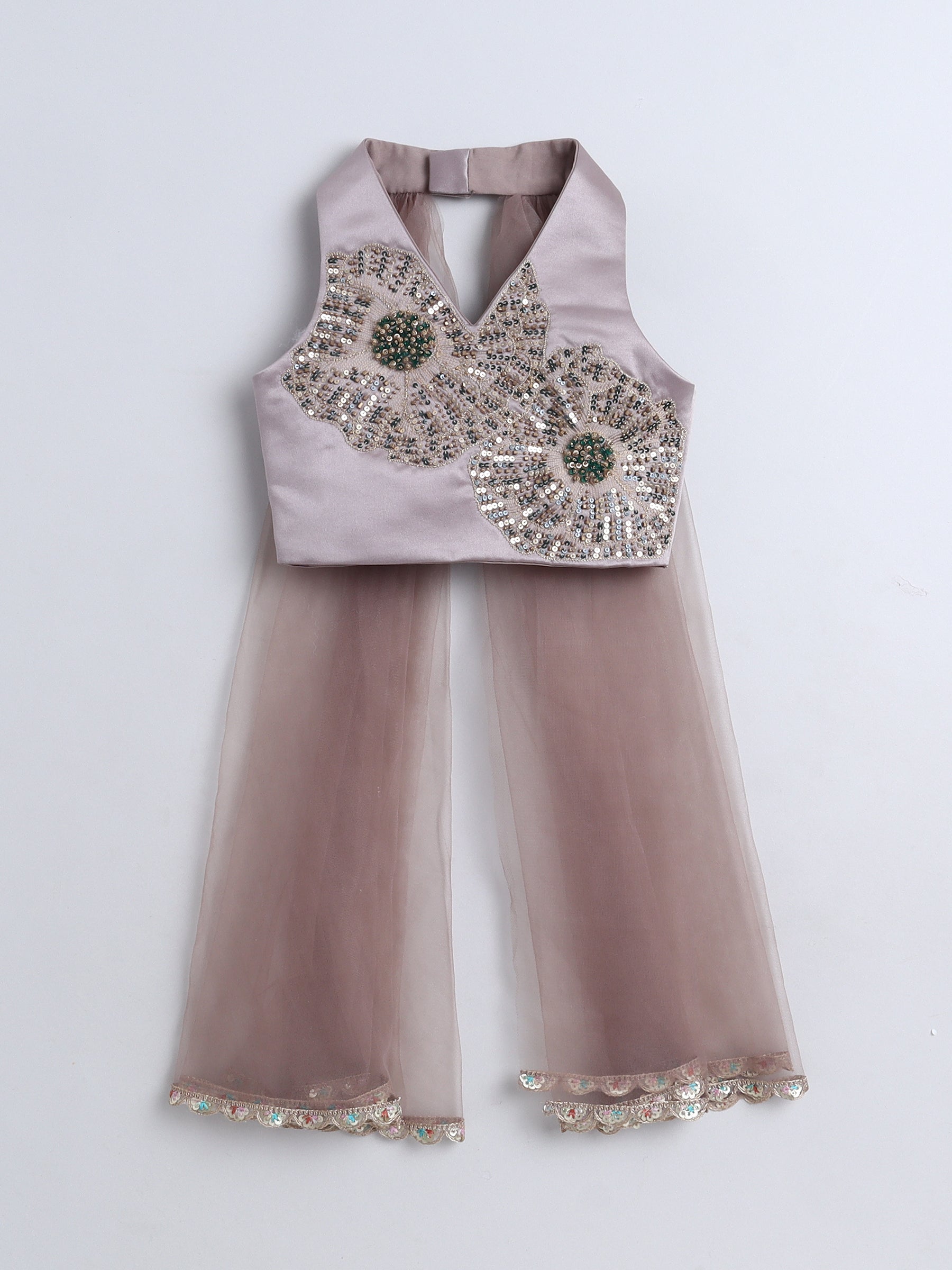 Design: A Sleeveless halter, 'V' neck blouse with a Net cape. Hand Embroidered Flower Motif that has a very elegant feel to it, enhanced for a festive shimmer. Back Blouse with beautiful High Neck enhanced by a cape attached at the back neck.